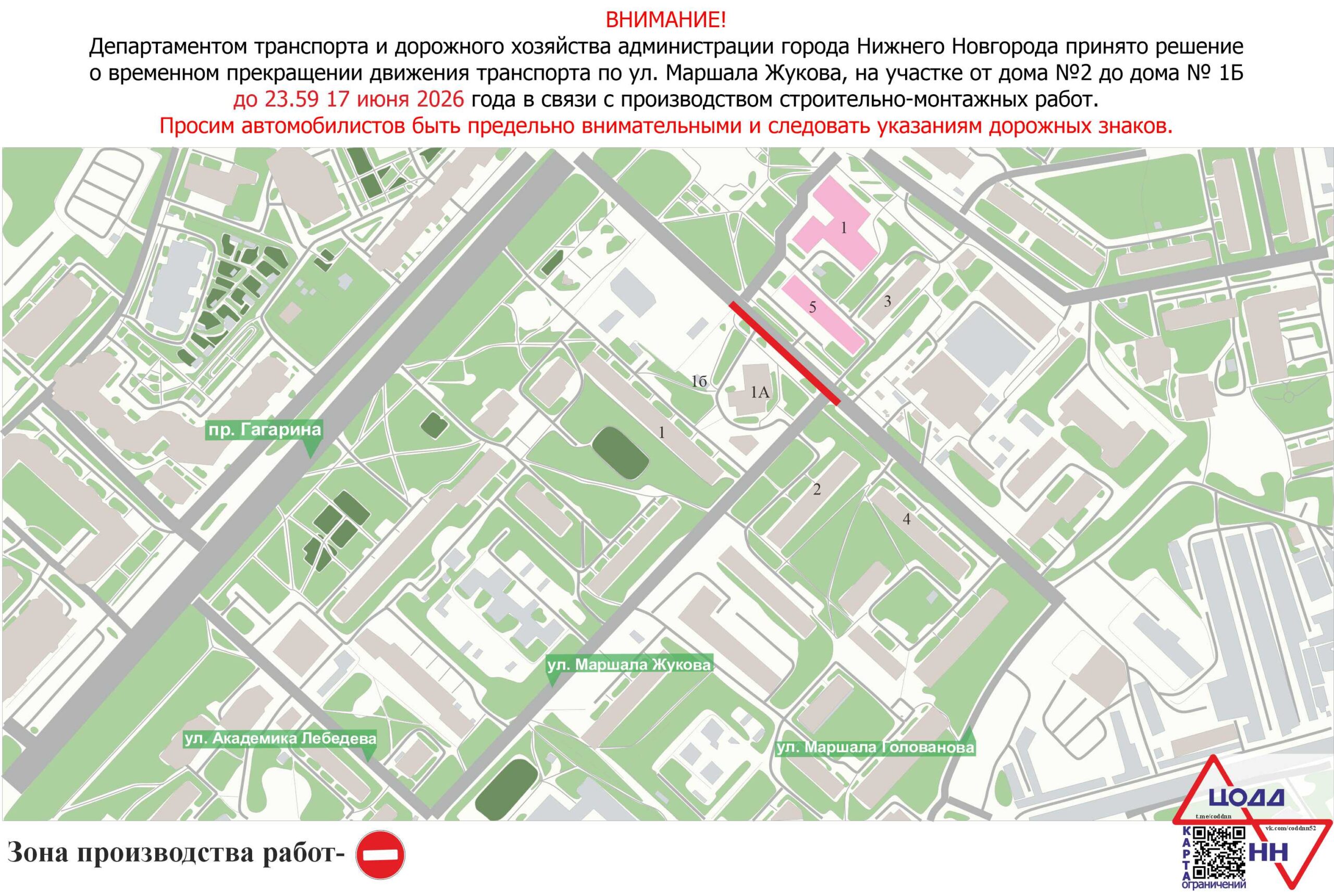 В Нижнем Новгороде будет ограничено движение транспорта по ул. Маршала Жукова, от дома №2 до дома № 1Б в связи с производством строительно-монтажных работ. Планируется, что движение по проезду между домами № 1а по ул. Маршала Жукова и № 5 по пл. Маршала Жукова будет частично ограничено. Движение транспорта по указанному проезду сохранится по суженной проезжей части по одной полосе в обоих направлениях. Ограничение продлится до 23.59 17 июня 2026 года.