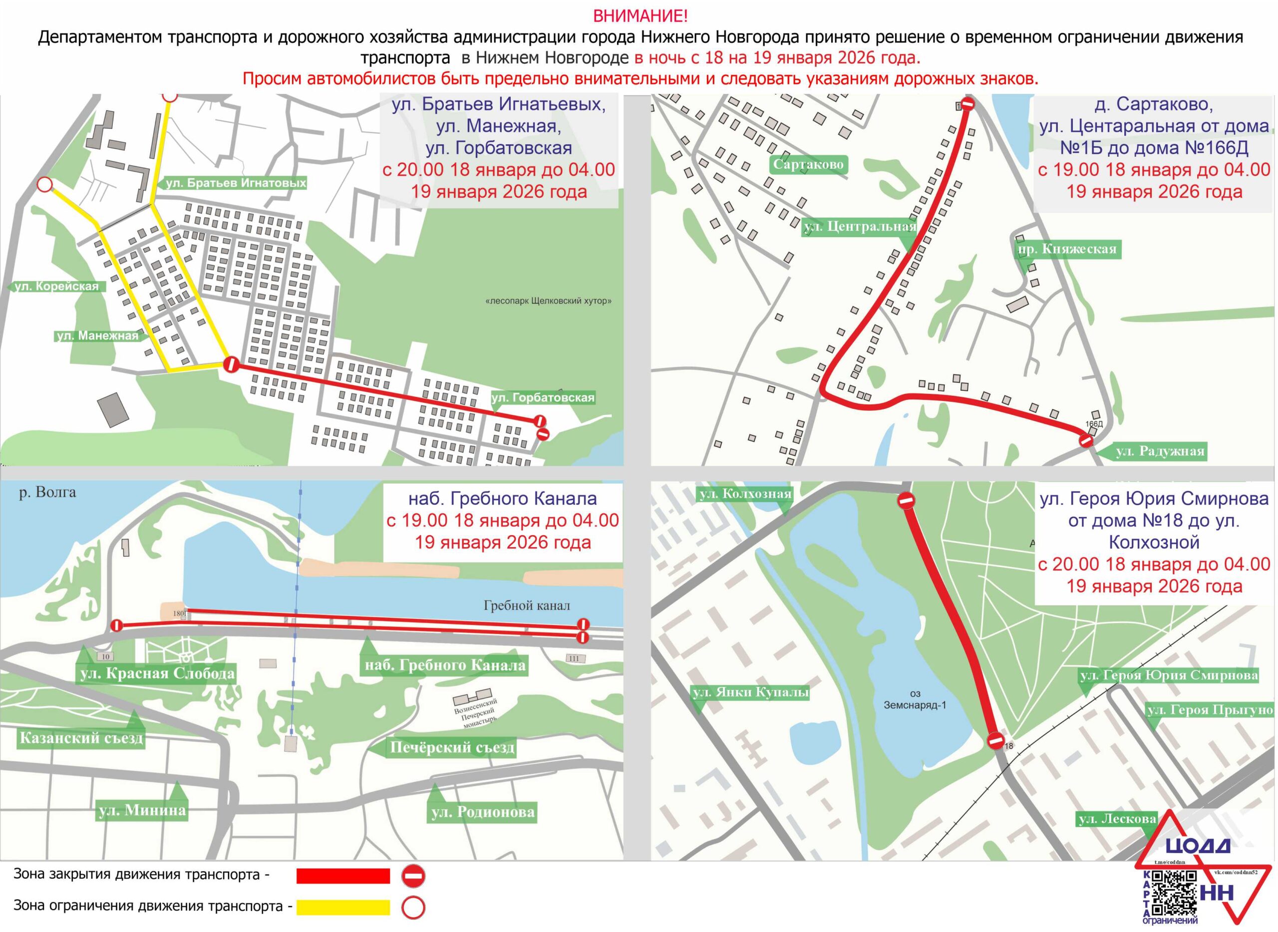 с 20.00 18 января до 04.00 19 января от дома №18 по улице Героя Смирнова до улицы Колхозной и на улицах Братьев Игнатовых, Манежной, Горбатовской;