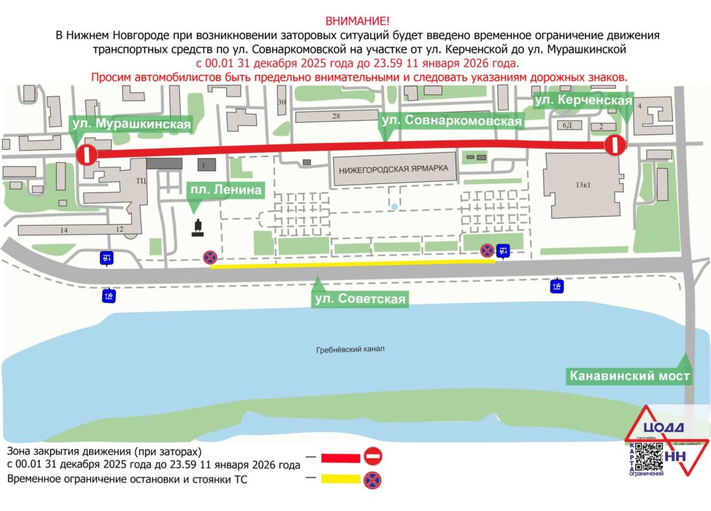 На участке ул. Советской с 00.01 31 декабря 2025 года до 23.59 11 января 2026 будет введено временное ограничение остановки и стоянки транспортных средств. При возникновении заторовых ситуаций с 00.01 31 декабря 2025 года до 23.59 11 января 2026 года будет приостановлено движение транспорта на улице Совнаркомовской (на участке улицы Керченской до улицы Мурашкинской).
