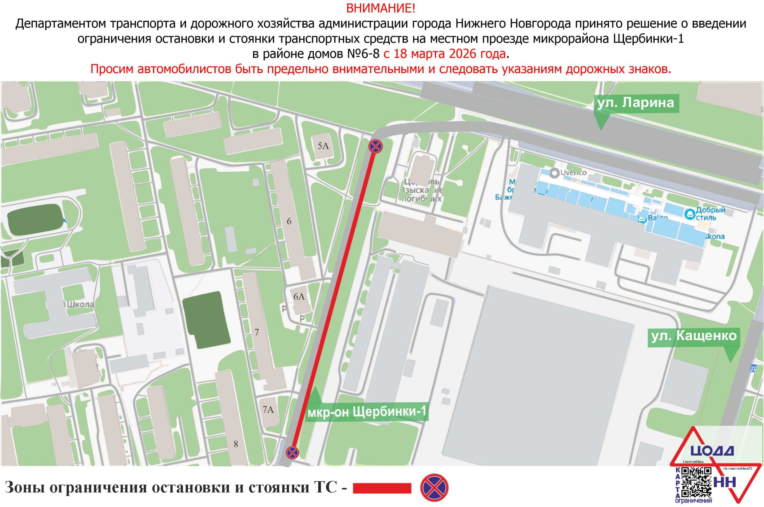 В Нижнем Новгороде с 18 марта 2026 года вводится ограничение остановки и стоянки транспорта на местном проезде микрорайона Щербинки-1 в районе домов № 6-8.