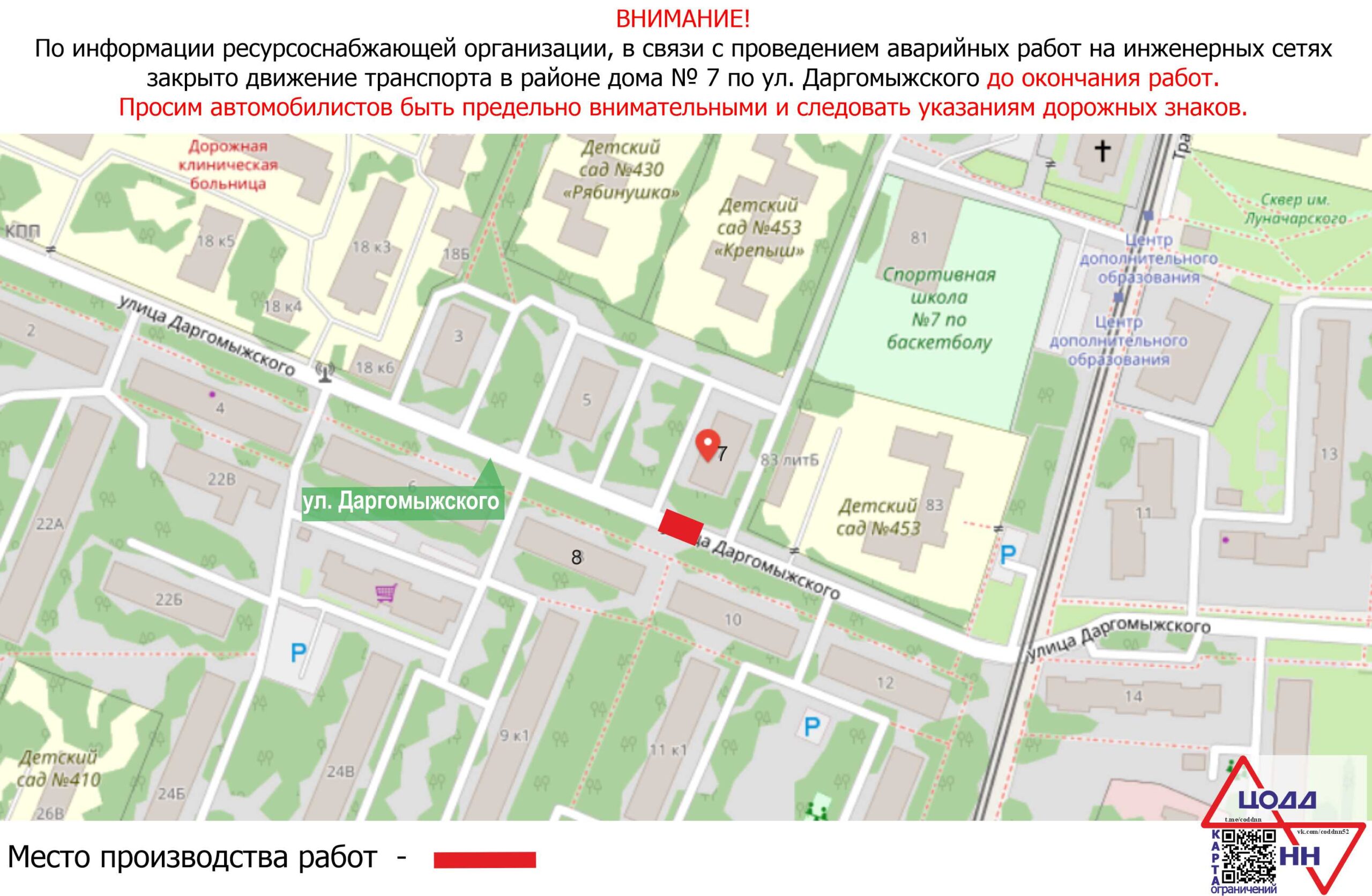В Нижнем Новгороде 16 марта закрыто движение транспорта по ул. Даргомыжского в районе дома № 7 в связи с проведением аварийных работ на инженерных сетях. Ограничение движения продлится до окончания работ.