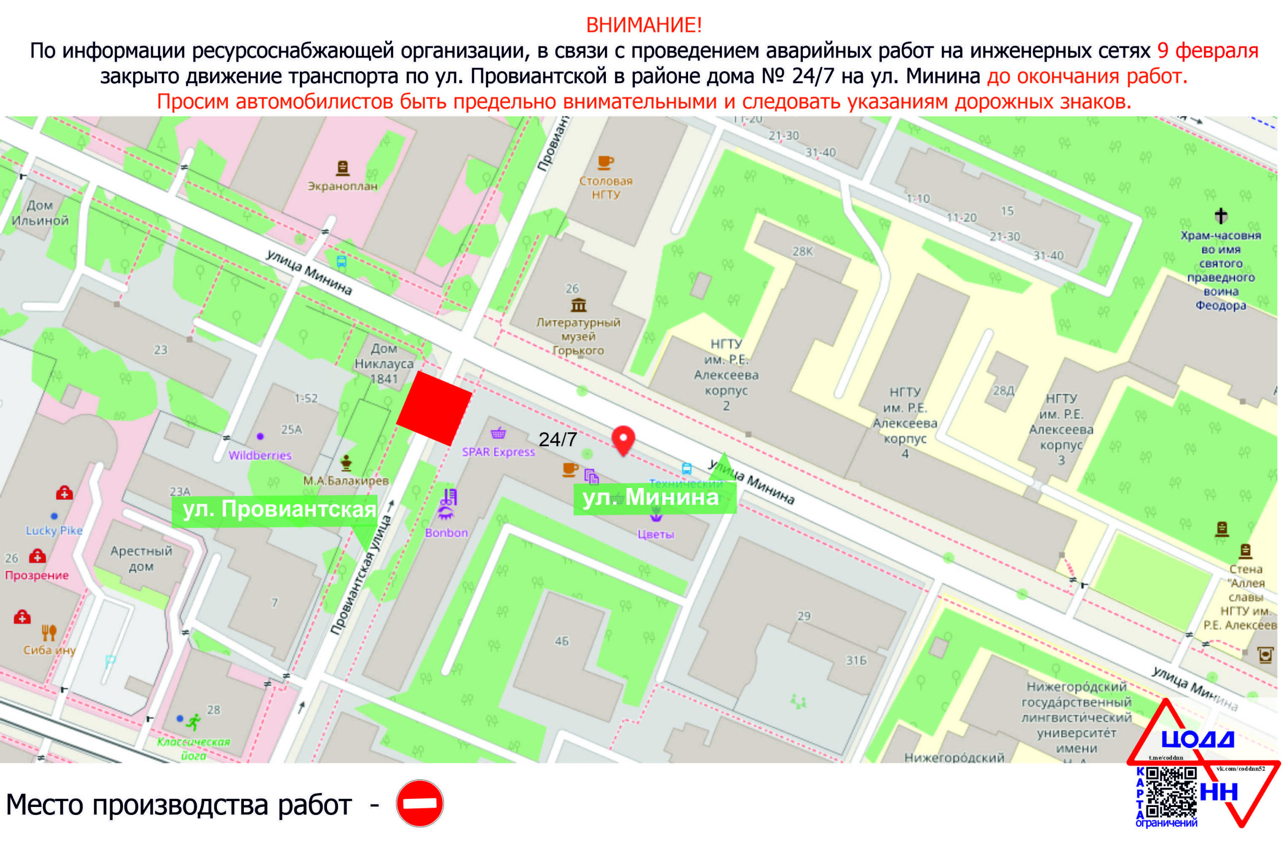 В Нижнем Новгороде 9 февраля закрыто движение транспорта по ул. Провиантской в районе дома № 27/4 по ул. Минина в связи с проведением аварийных работ на инженерных сетях. Ограничение движения продлится до окончания работ.